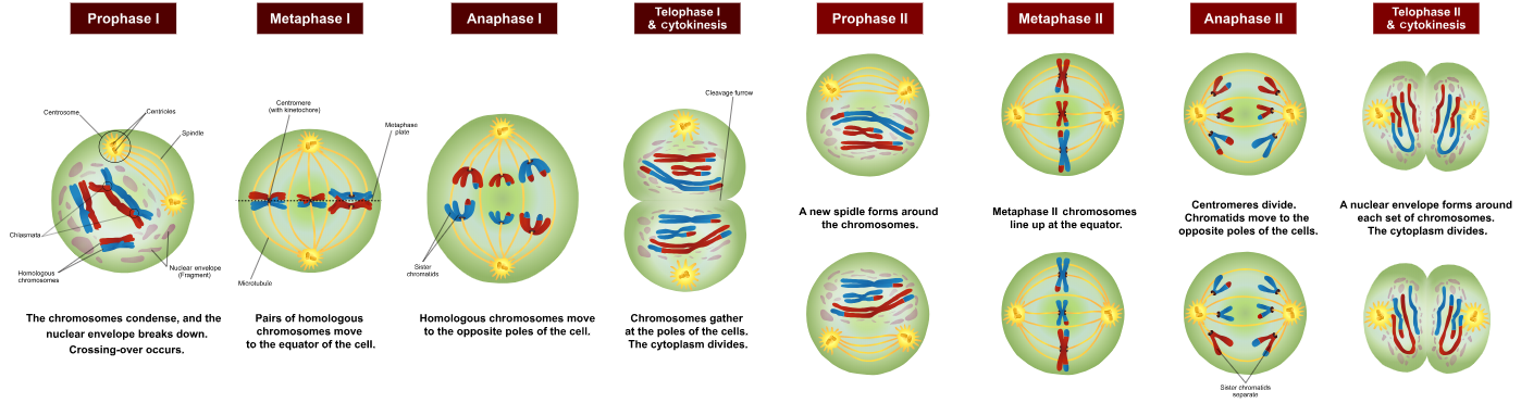 During prophase I, the chromosomes condense as the nuclear envelope breaks down. By this point all of the cell's genetic material has replicated, so each chromosome is an X-shape consisting of two identical chromatids. Also during this phase, homologous pairs of chromosomes line up and undergo crossing over - homologous sections of the chromosomes swap. This process increases the genetic diversity of the haploid cells that are produced at the end of meiosis. As with mitosis, the centrosomes and spindle fiber structures form during prophase I.