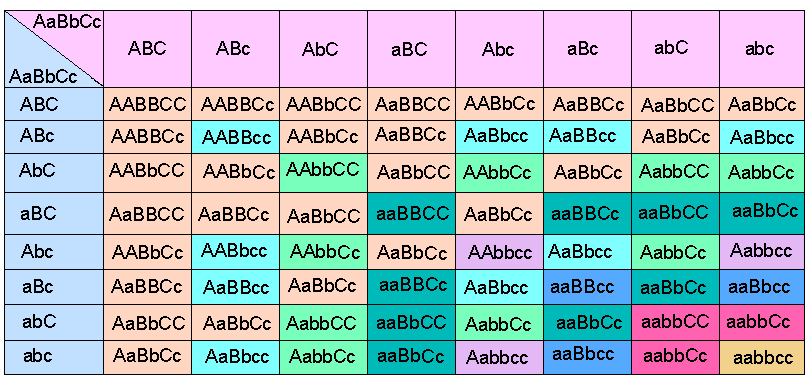 Crosses and Punnett squares may be used with any number of genes. As of the 2019 rules, trihybrid crosses are a Nationals-only topic, rarely seen on tests, and higher crosses are not allowed on tests. Like single- and double-factor crosses, three-factor (trihybrid) crosses show three different traits that are crossed. The image at right shows a trihybrid cross between two parents that are heterozygous for all three traits (that is, a genotype of AaBbCc). Trihybrid crosses are rarely seen on tests, so don't spend too much time practicing them until the later stages of competition.