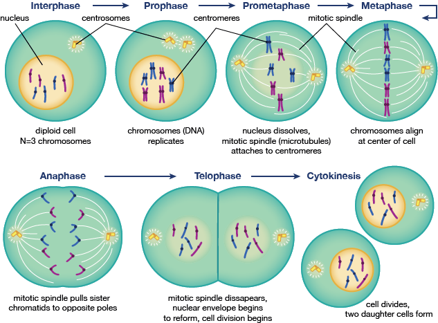 The body grows by cell division, and mitosis is the process of cell division in somatic cells (that is, all cells other than the germ cells which produce eggs and sperm). In mitosis, a single diploid (two copies of each chromosome, one from each parent) cell divides to produce two diploid cells (the daughter cells). It is a part of the cell cycle, which describes the general life cycle of a cell.