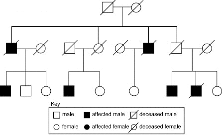 Often, questions involving pedigrees may ask competitors to determine the genotypes of several individuals or identify the inheritance pattern of the trait in question. For example, consider the pedigree at right. Based on the fact that neither individual in the first generation has the trait but some of their direct offspring do, we know that carriers are not marked in this pedigree (and we also know that the trait cannot be dominant). The fact that all six affected individuals are male strongly implies that the trait is sex-linked. Y-linkage can be ruled out because some affected sons have unaffected fathers, and vice-versa. Therefore, the most likely inheritance pattern for this trait is X-linked recessive. Note that we have not ruled out an autosomal recessive inheritance pattern since there is not enough information in this pedigree to do so.
