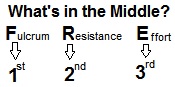 One way to remember the different classes of levers is with the mnemonic "FRE 123", in which "FRE" stands for fulcrum, resistance, and effort, respectively. These correspond in order to the class of lever (the "123" in the mnemonic). Depending on which component of a lever (fulcrum, resistance force, or effort force) is in between the other two, the class of lever can be determined by matching that letter with its corresponding number. For example, knowing that the effort force is in the middle between the fulcrum and resistance force in a pair of tweezers, it can be determined that tweezers are a 3rd class lever (because 3 corresponds the "E" in "FRE"; "E" representing the effort force, which is in the middle for tweezers).