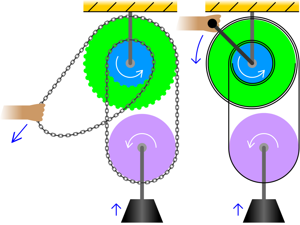 A differential pulley is made of two pulleys and one string. It is known for its high mechanical advantage and relatively simple design. In the figure to the right, the left is a differential pulley, while the right is a differential windlass.