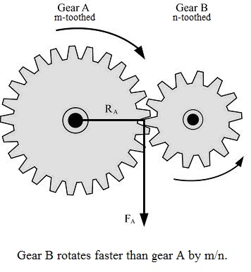 A gear is a rotating machine part with teeth. Two gears with their teeth meshed together transmit torque. If the input gear has teeth, and the output gear has teeth, its mechanical advantage is given by . For most gears (ones with teeth on the outer surface), the rotation of the output gear are in opposite direction as the rotation of the input gear.