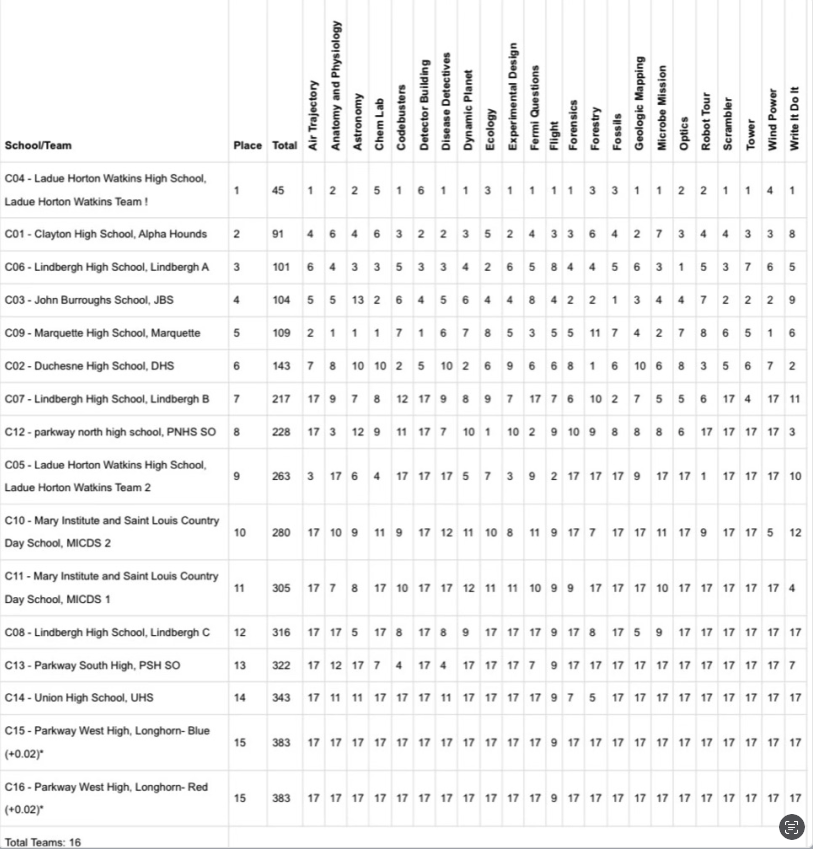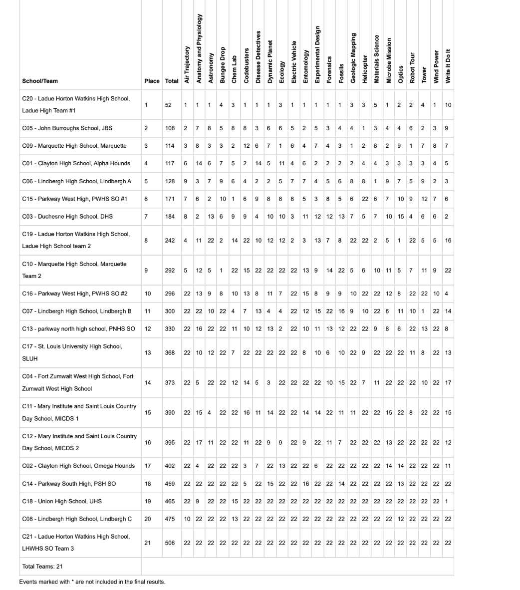 | 2022 | Ladue Horton Watkins High School (46) | 2nd (101) | Clayton High School (72) | 3rd (158) | Lindbergh High School (119) | 4th (164) | 2/12/22 | 13 | 5 |