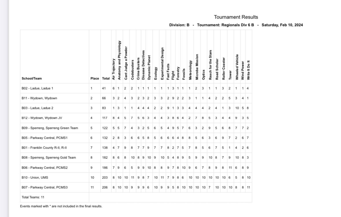 | 2024 | Ladue Middle School (41) | 2nd (70) | Wydown Middle School (66) | 3rd (95) | Sperreng Middle School (122) | 4th (204) | 2/10/24 | 11 | 4 |