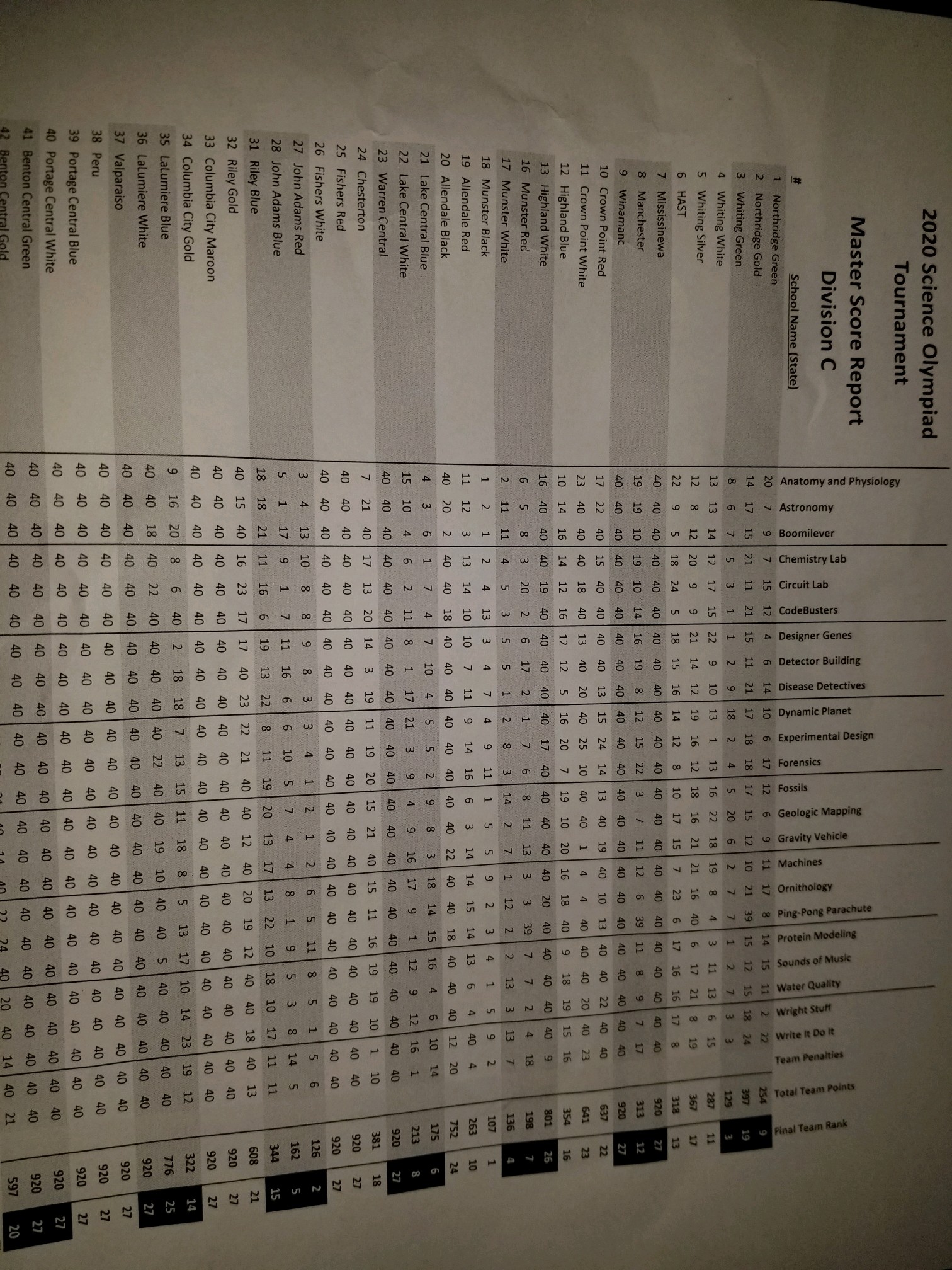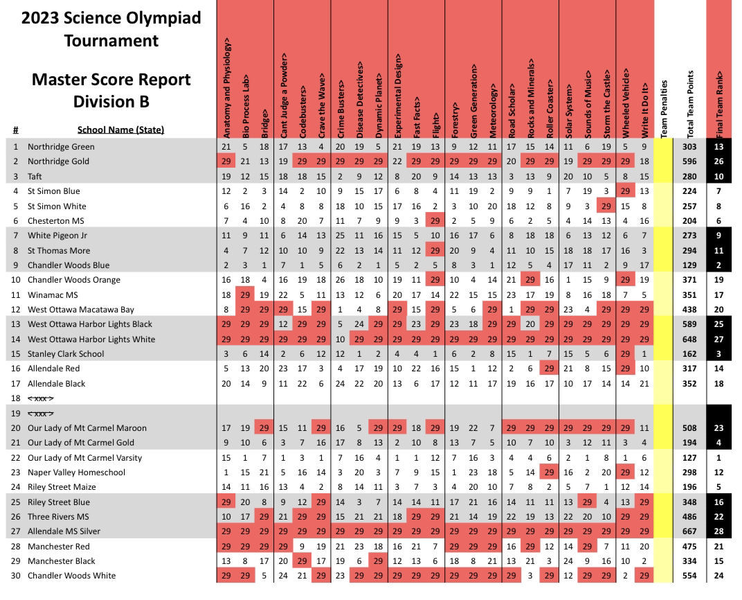 | 2013 | Grandville MS (127) | Stanley Clark (139) | Wilbur Wright Middle School (173) | Mississinewa Middle School (185) | Chesterton Middle School (195) | 23 |