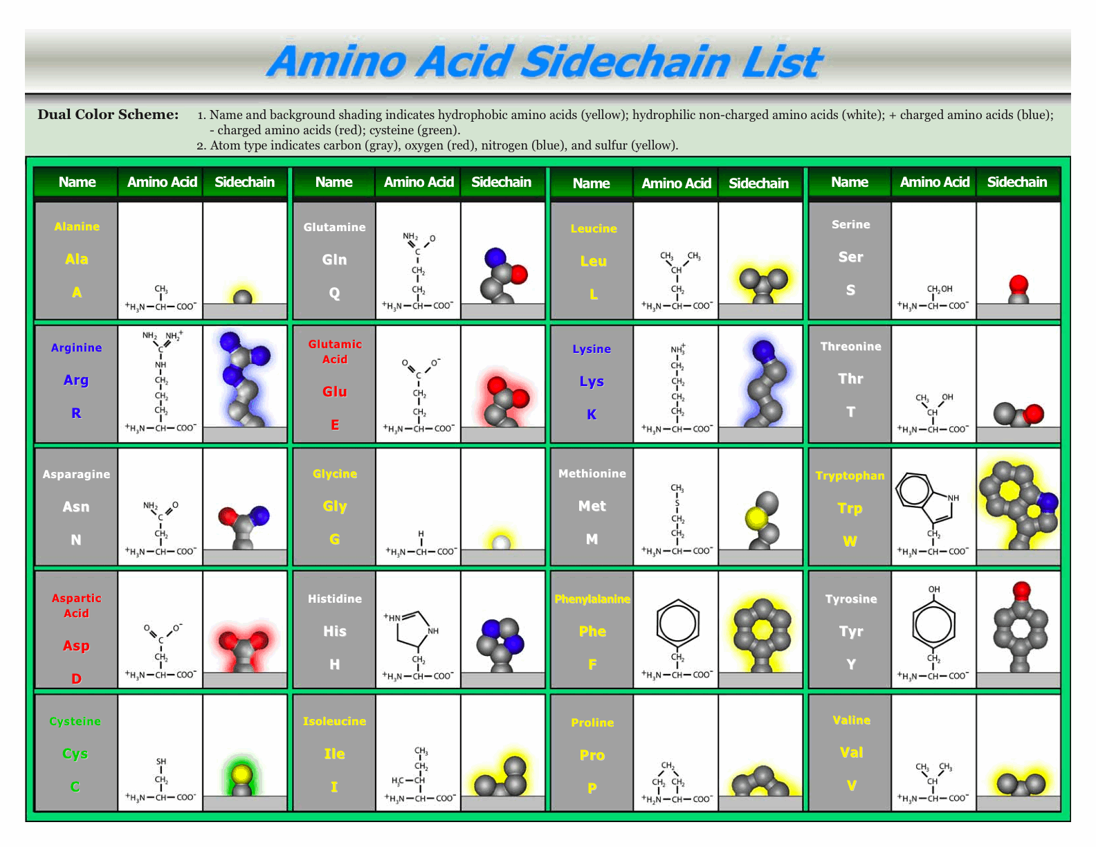 In order to understand the structure of a protein, it is necessary to understand the properties of amino acids. There are 20 main varieties of amino acid, which differ only in their sidechain (sometimes called an "R group"). Each amino acid is known by three names - the full name, usually derived from what the amino acid was first isolated from; the three-letter abbreviation; and a one-letter abbreviation. For example, tyrosine (from Greek tyros for cheese) is also known as Tyr and Y.