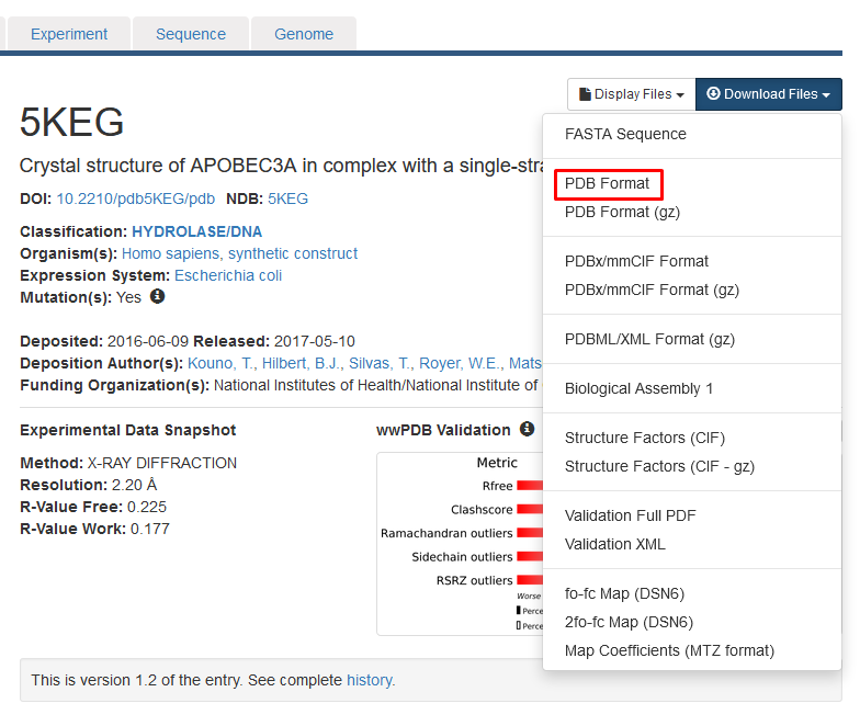 One of the main benefits to downloading Jmol is having the ability to open any desired PDB file. In order to view a desired protein, the PDB file for that protein should be present on the computer with Jmol installed. To download a PDB file, go to its structure summary page (linked to in the Year-Specific Information section) and click the "Download Files" option in the upper-right corner. A drop-down menu will appear, as shown to the right. Click on PDB Format, and save the file in the same folder as Jmol.jar.
