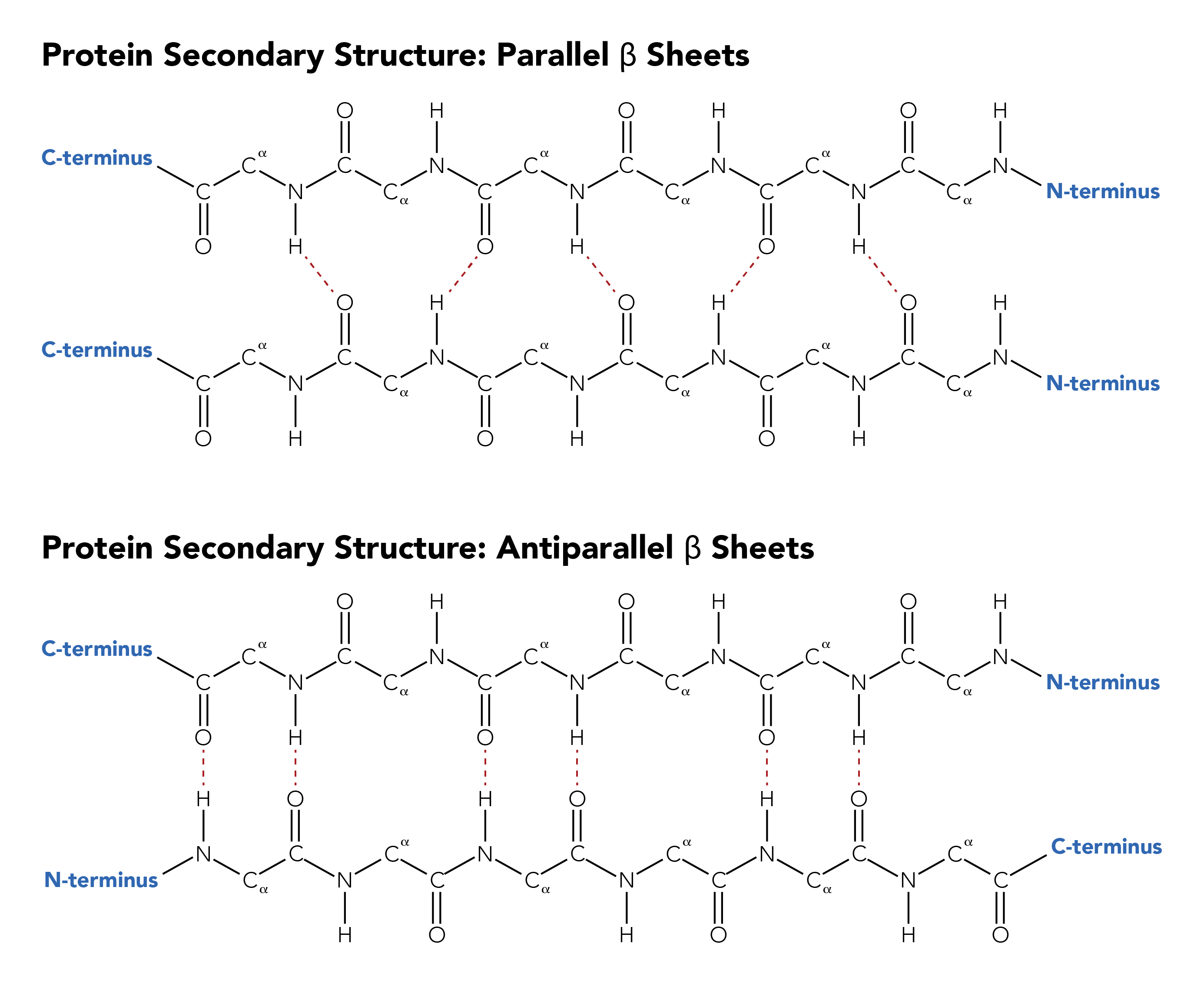 Beta sheets, on the other hand, are made up of many beta strands- kinked sequences of residues separated by loops. These strands line up next to each other. Most beta sheets are antiparallel, meaning that the C-terminus of one strand is adjacent to the N-terminus of the next strand. Antiparallel beta sheets are the most stable because it allows the inter-strand hydrogen bonds to be planar. However, some beta sheets are parallel, meaning that the beta strands in the sheet all have the same directionality, which makes it less stable due to the hydrogen bonds being nonplanar. Some strands have a mixed bonding pattern, with some sheets being parallel and others being antiparallel; this structure is most likely less stable than a purely antiparallel beta sheet.