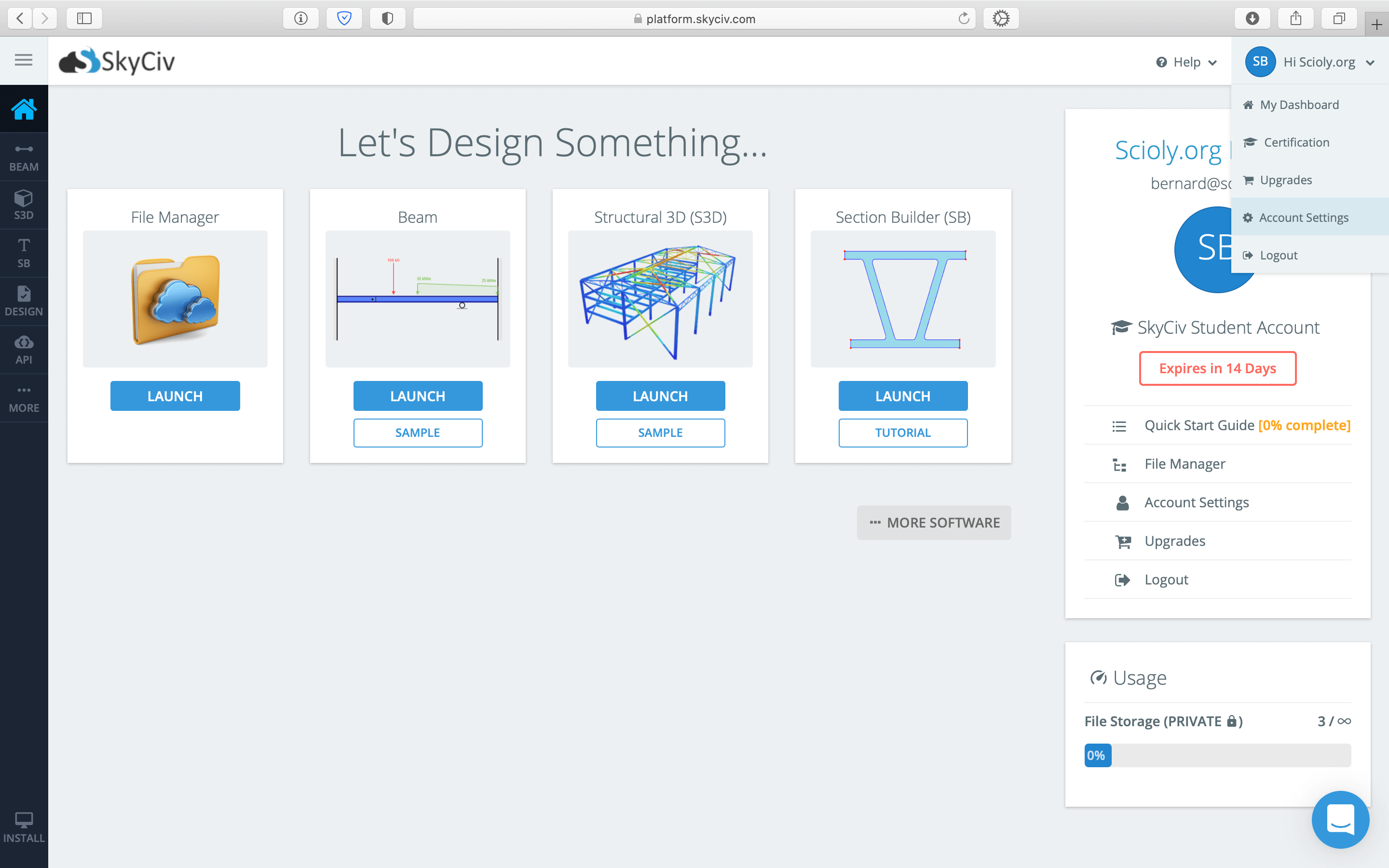 The add-on can be enabled in SkyCiv by clicking Hi YourName > Account Settings > Software Settings > Science Olympiad [S3D] > On.