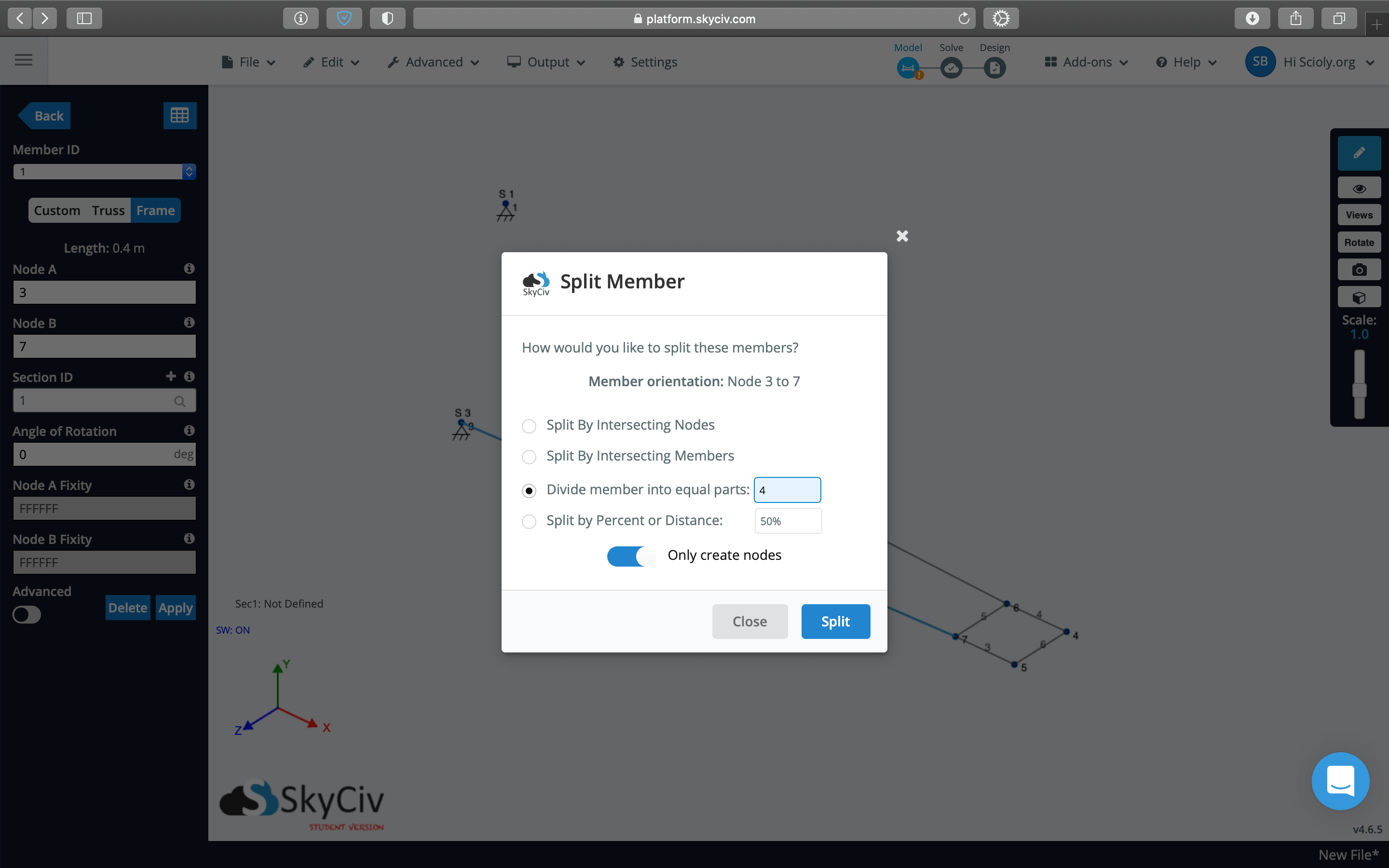 If you want to make many nodes along a line, for example to add bracing as shown below, you do not need to define each node individually and can instead use the "split member" tool! To split a member, you only need a member to split and the number of equal parts into which you want to split the member.