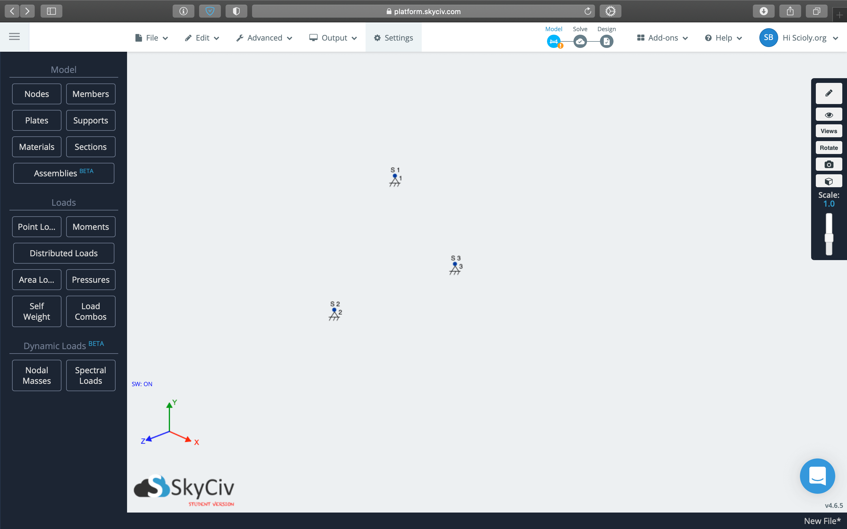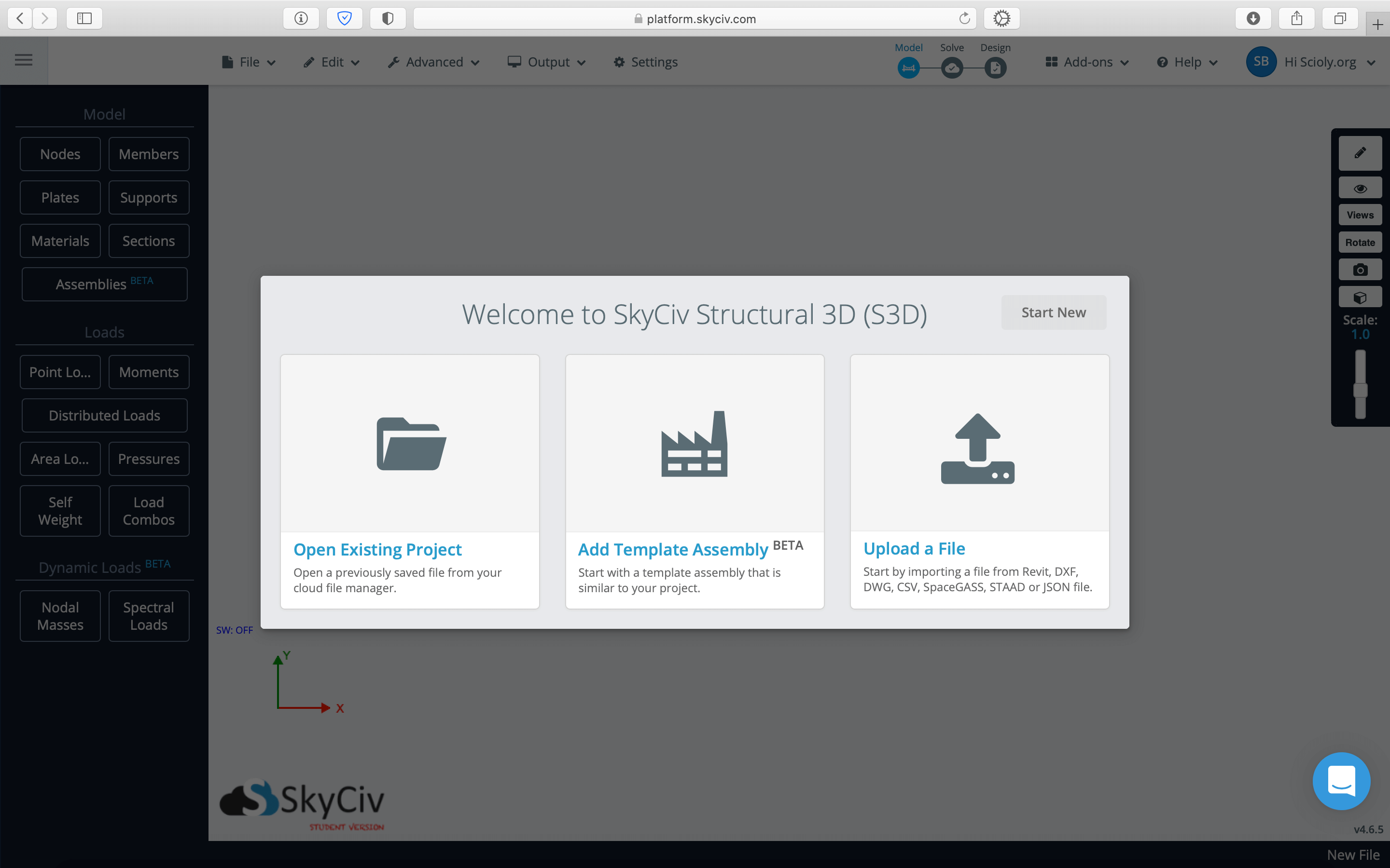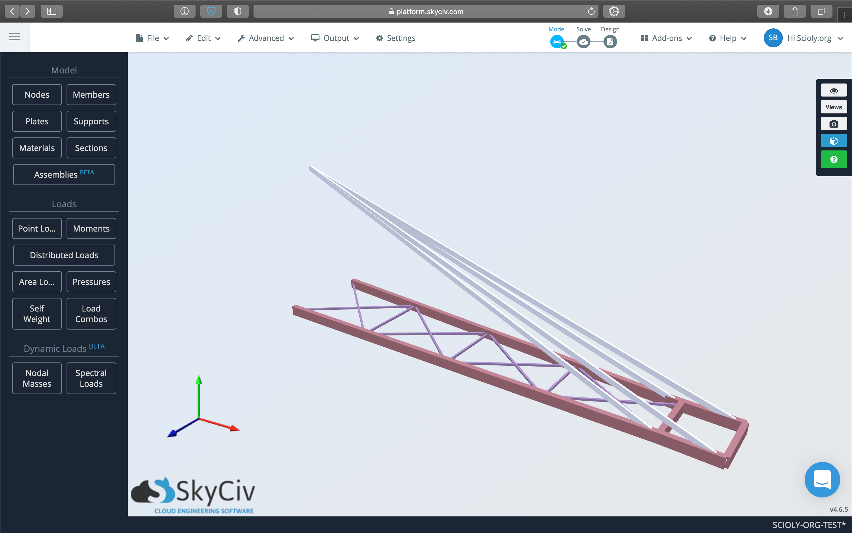 SkyCiv is an in-browser cloud-based software (i.e. it is not downloaded but is accessed by a URL). SkyCiv offers many applications, of which Science Olympiad uses the Structural 3D (S3D) application. In S3D, SkyCiv performs structural analysis by simulating three-dimensional structures as members and nodes with their properties defined by materials, sections, and supports. For Digital Structures, S3D is used in conjunction with the Science Olympiad add-on.