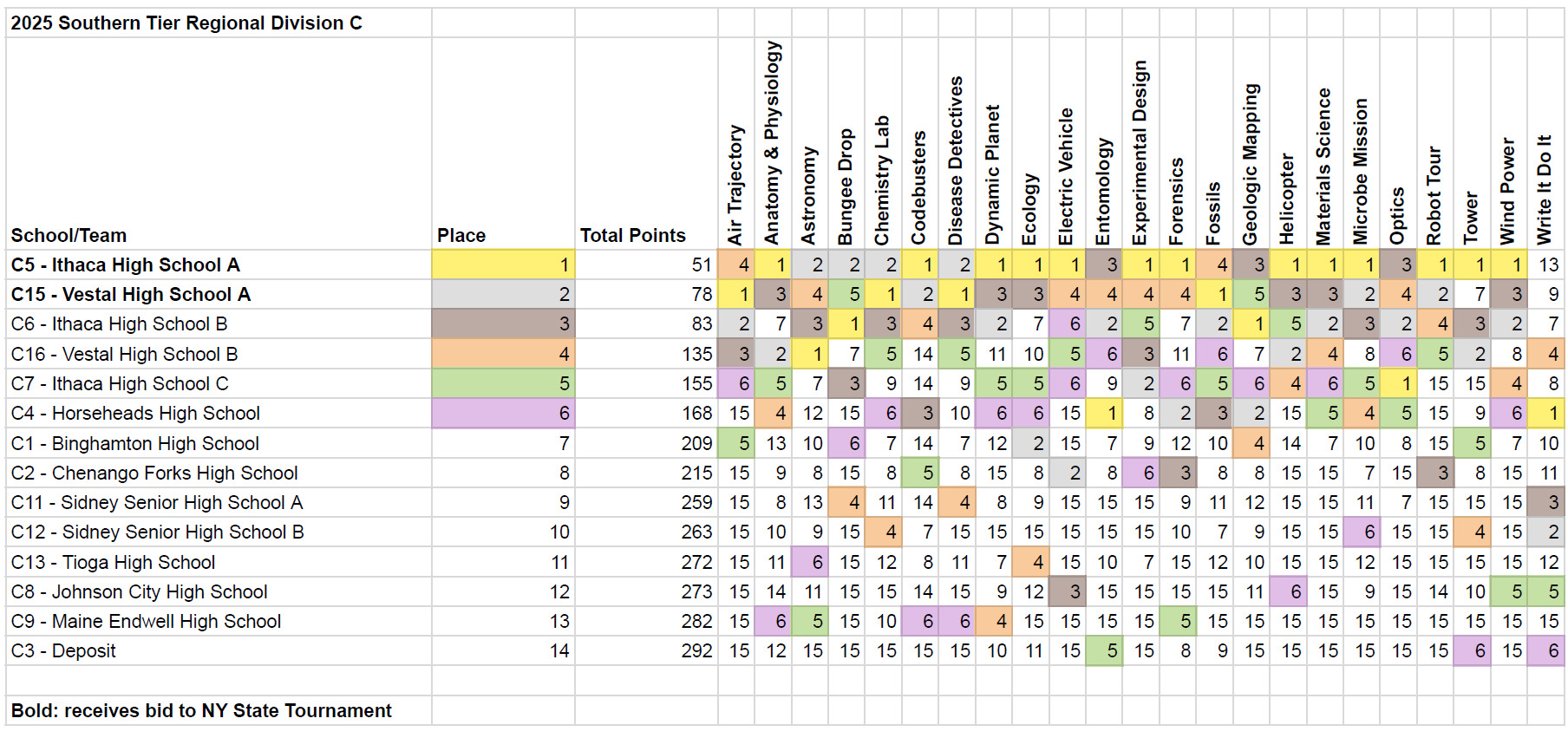 The Southern Tier Regional is a Division B and Division C regional tournament in New York, encompassing teams from Allegany, Steuben, Yates, Schuyler, Chemung, Tompkins, Tioga, Broome, Chenango, Ostego, and Delaware Counties. Currently, Division B is hosted by Maine-Endwell Middle School, while Division C is hosted by Ithaca High School. In the past, Division C has been hosted by Maine-Endwell Middle School and Binghamton University[1], [2], [3].