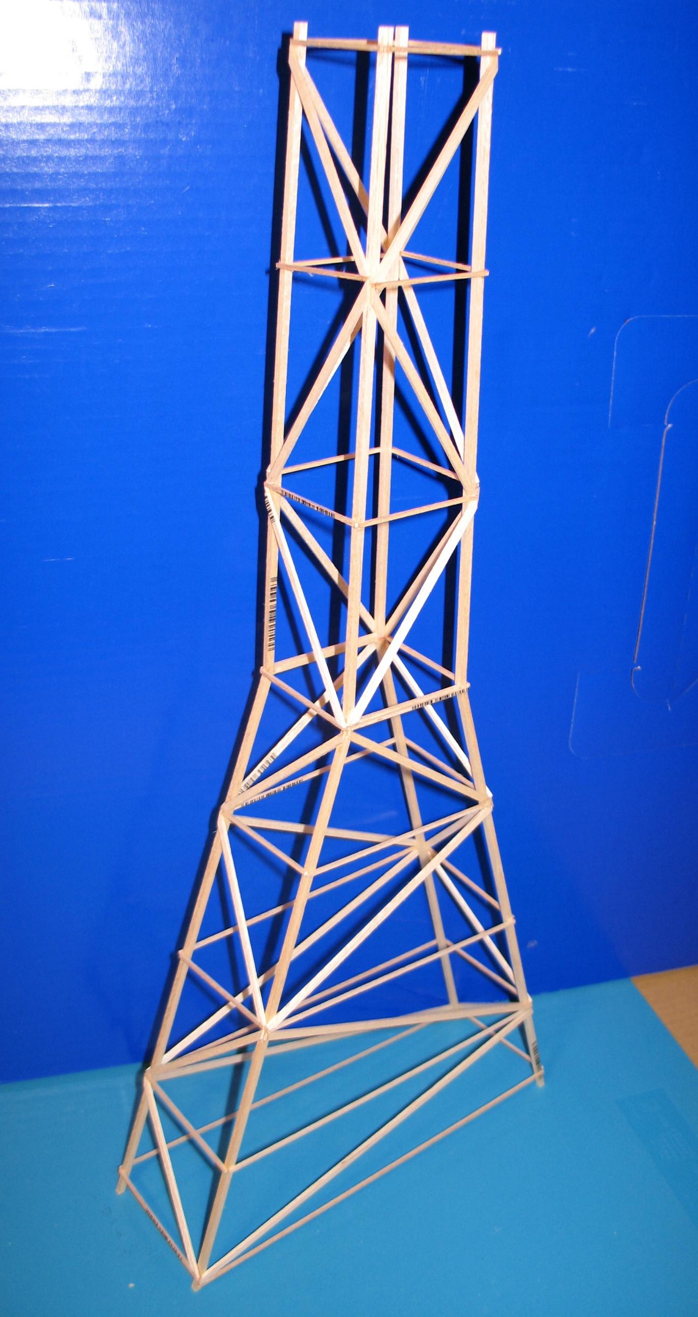 After the number of legs is decided, the bracing is the part that towers are won and lost by. It depends on the type of leg design is used, but generally, balsa wood legs of dimensions 3/16x1/8in need to be braced every 5 or 6cm all the way up (by the way, a solid wood square is not the best way to go for legs). Also, with the bracing, equality is of high importance. If you brace at 5cm and then the next space is 8cm, you're testing the 8cm space. It would be better to brace at 6.5 cm and 6.5 cm in this example.