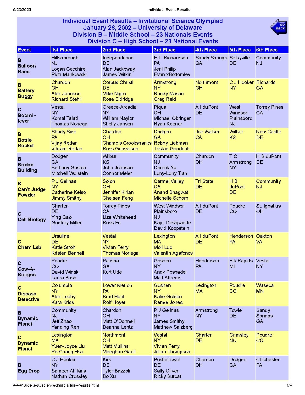 | 2002 | Poudre High School (153) | The Charter School of Wilmington (187) | Lexington High School (244) | Northmont High School (256) | Columbia High School (260) | 1/26/02 | 58 |