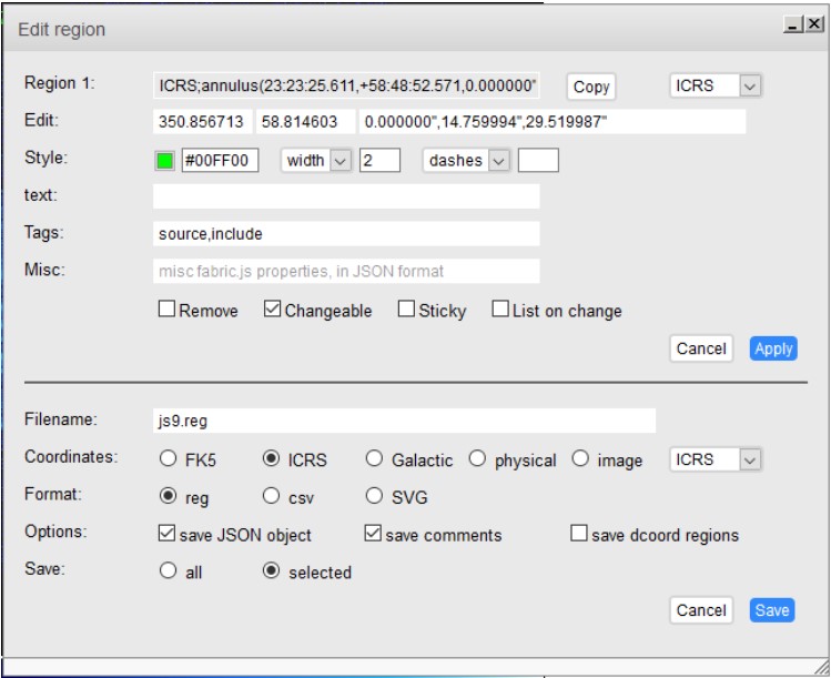 This region is a target-shape. It is considered by many functions as multiple regions, with each space between the lines as its own region. When you insert an annulus, it defaults in the center of your viewing field with two regions. To change the number of regions, double-click on the annulus to bring up the configuration menu. In the third field after the "Edit:" label (this is also the longest of the three fields), there will be three default values, one of them is 0". To add another region, you will need to add another value behind this, which will mark the radius of the next circle out (make sure to insert a comma between all values and quotation marks after each measurement, indicating arcseconds).