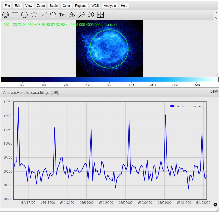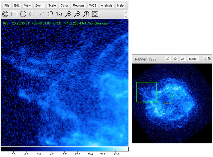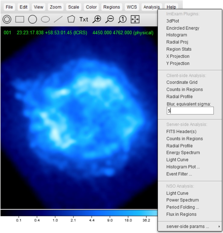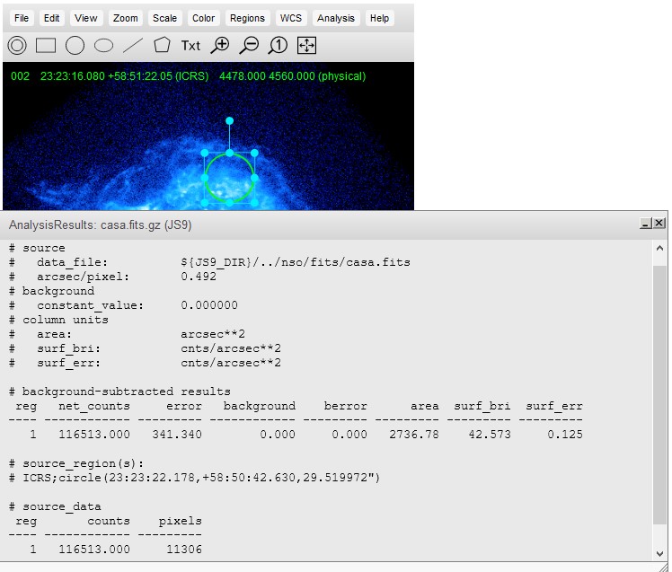Analysis in JS9 is done through regions in an image. A region will be placed on an image, and all pixels inside the region will be analyzed using different analysis functions. All analysis functions can be found in the "Analysis" menu, or can be done through the JS9 console. To open the JS9 console, go to View > Console.