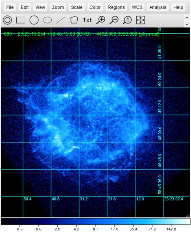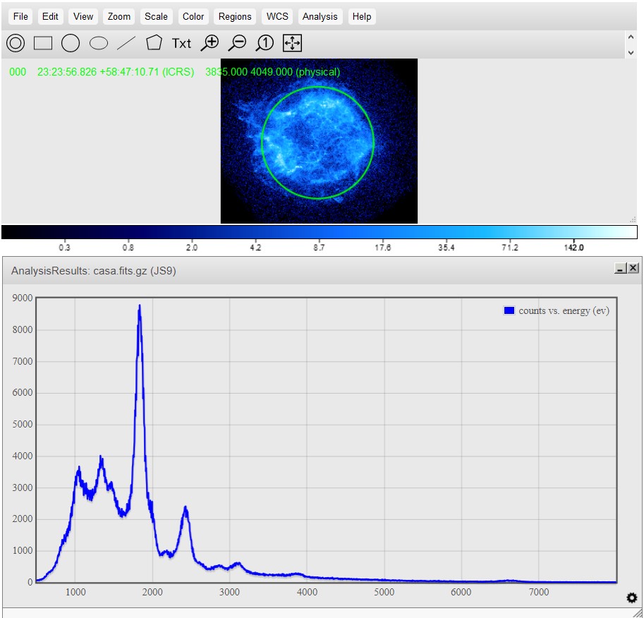 This generates an energy spectrum of all regions. It displays a graph with energy (electron volts) on the x-axis and counts (photons) on the y-axis. This spectrum is extremely useful in an analysis, as it gives the peak wavelength of the X-Ray spectrum for temperature measurements, and displays X-Ray spectral emission lines of the object. You can then match these spectral lines to their corresponding element (a table of some common lines can be found here) and determine what elements are present in the object. This is very useful for classifying supernovae, as each class will have some specific spectral lines that appear for the specific elements it produces. | ![]() |