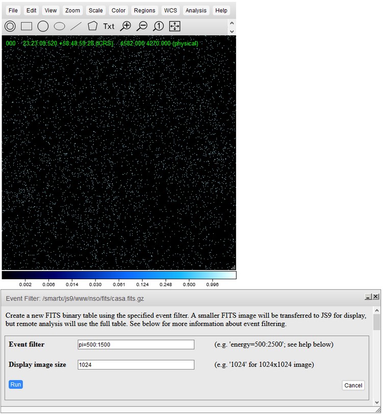 This function will generate a new FITS file based on specified criteria. To generate the new FITS file, run the event filter analysis. You will be prompted to enter your criteria. To do this, you will have to specify a column name (see the above row for information on columns) and a range in that column to display in the format column=lower:upper. For example, pi=500:1500 will result in an image that only displays pixels that are between a pi value of 500 and 1500. You are able to analyze this image as you would any other image. You can switch back and forth between this image and the original image using the File menu. You can pair this function with the overlay function to get an image that shows different ranges in different colors.
