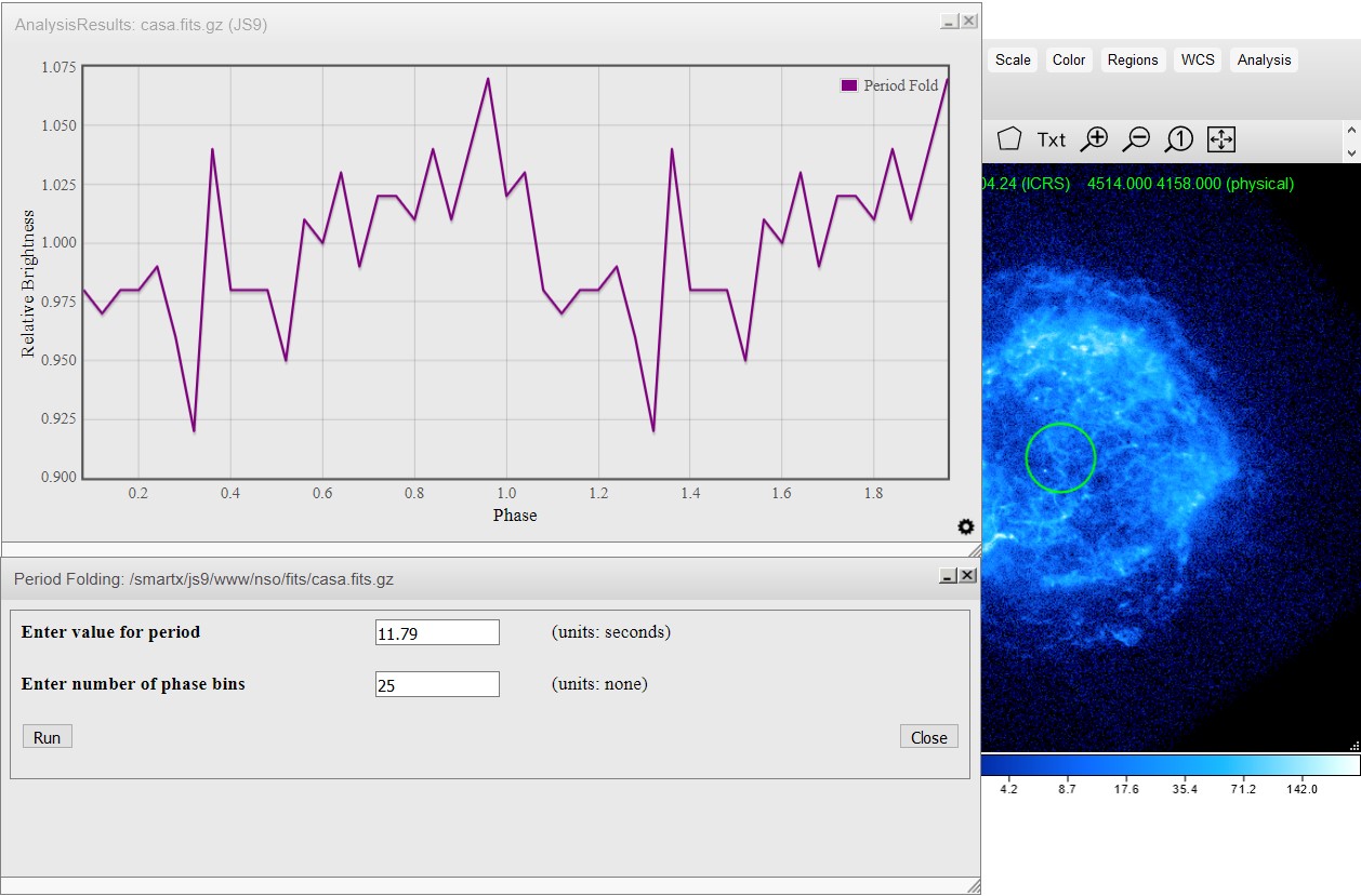 NSO Analysis contains analysis functions that were specifically made as an addition for the Science Olympiad version of JS9. The following analysis functions can be found in the analysis menu of JS9 under the grayed-out "NSO Analysis" Heading. Note that this will only work if you are in the Science Olympiad specific JS9. NSO Analysis is also server-side, so you will have to upload your FITS file to the remote JS9 server to use these analysis functions.