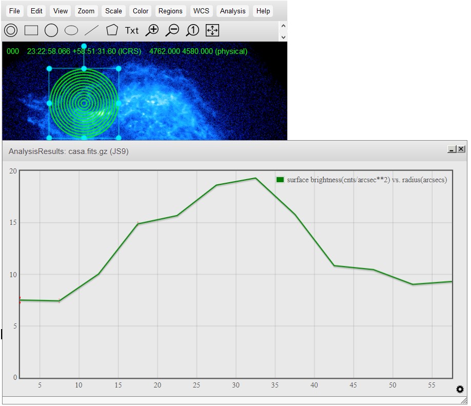 Radial Profile requires an annulus. This determines the flux in each region (in photons/square arcsecond) and plot the value for each region in the annulus on a graph of the surface brightness vs. the radius. This is identical to the Client-side analysis version. | ![]() |
