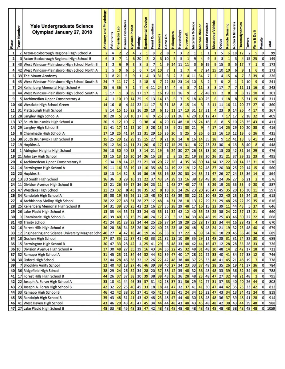 - 2 A second team from Acton-Boxborough High School South placed 5th with 263 points, a second team from West Windsor-Plainsboro High School South placed 6th with 268 points, and a second team from Conestoga High School placed 7th with 300 points.